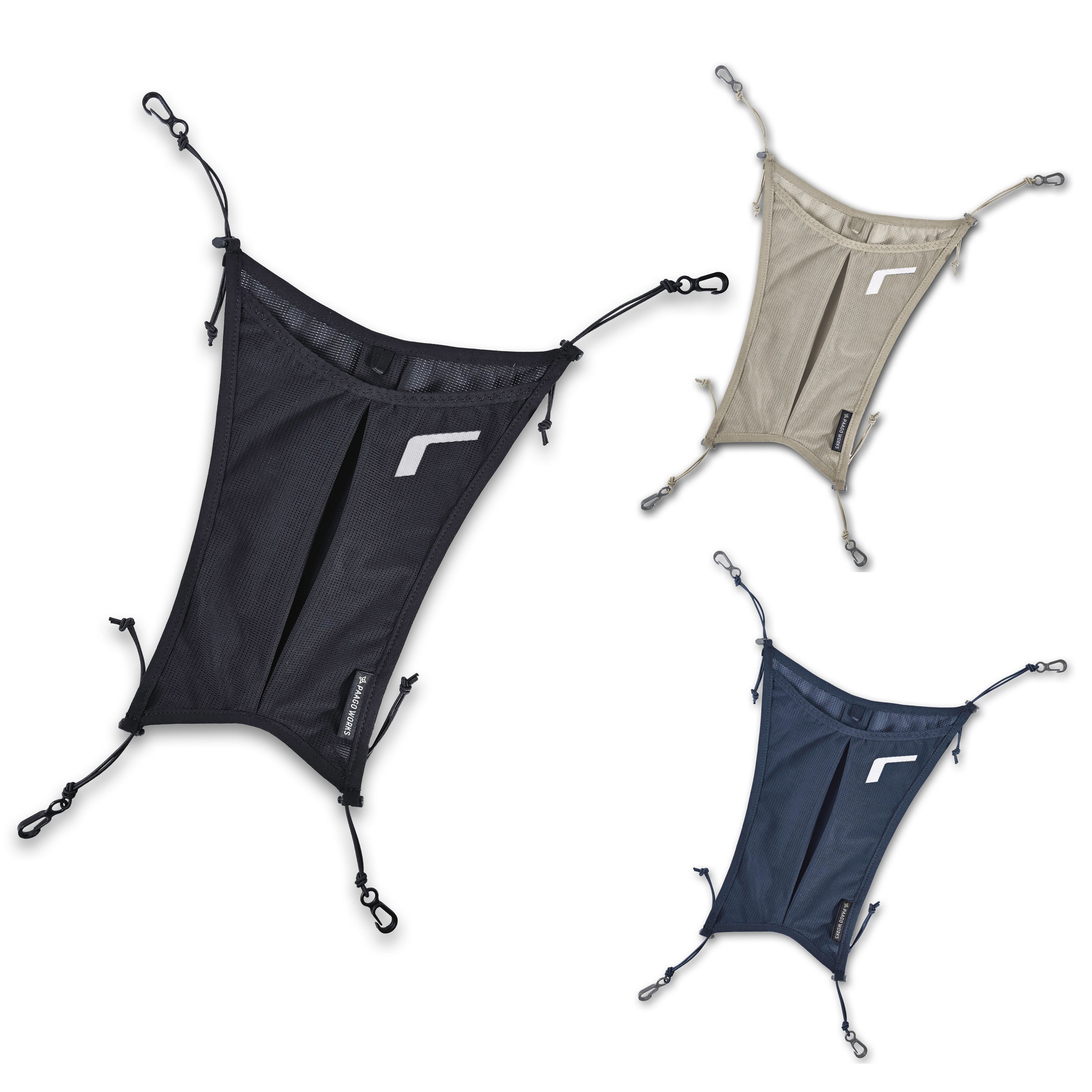 いわゆるヘルメットホルダーとしてよく使われる形ですが、本体にはポケットにもなっているのでウインドシェル、保温着、レインウェアなどをサッと収納することも可能です。