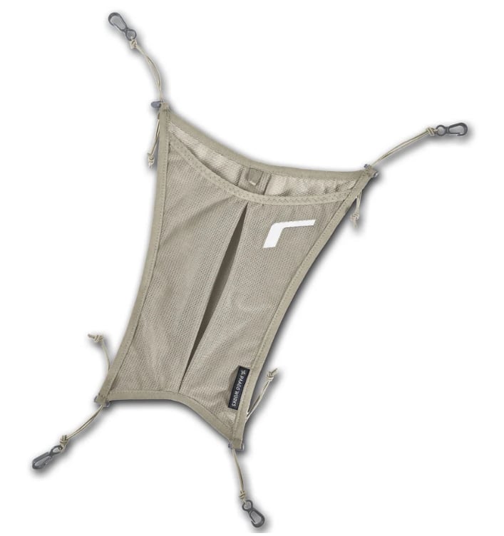いわゆるヘルメットホルダーとしてよく使われる形ですが、本体にはポケットにもなっているのでウインドシェル、保温着、レインウェアなどをサッと収納することも可能です。
