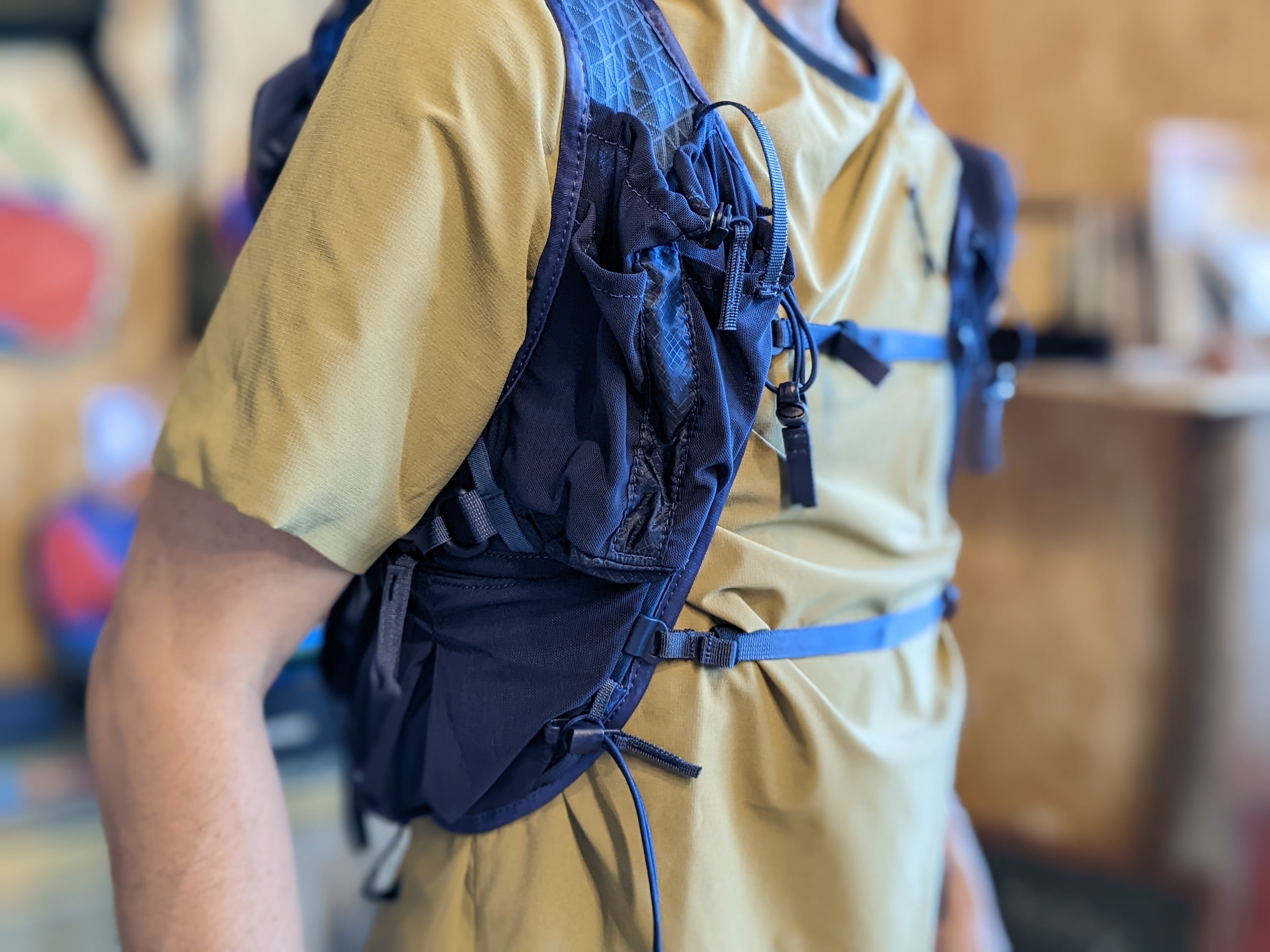 水分を摂るためのボトルを入れてもバックパックを降ろさず取れる絶妙な位置にあり、僕は水分だけでなくウェアの収納に使って体温管理をしていました。