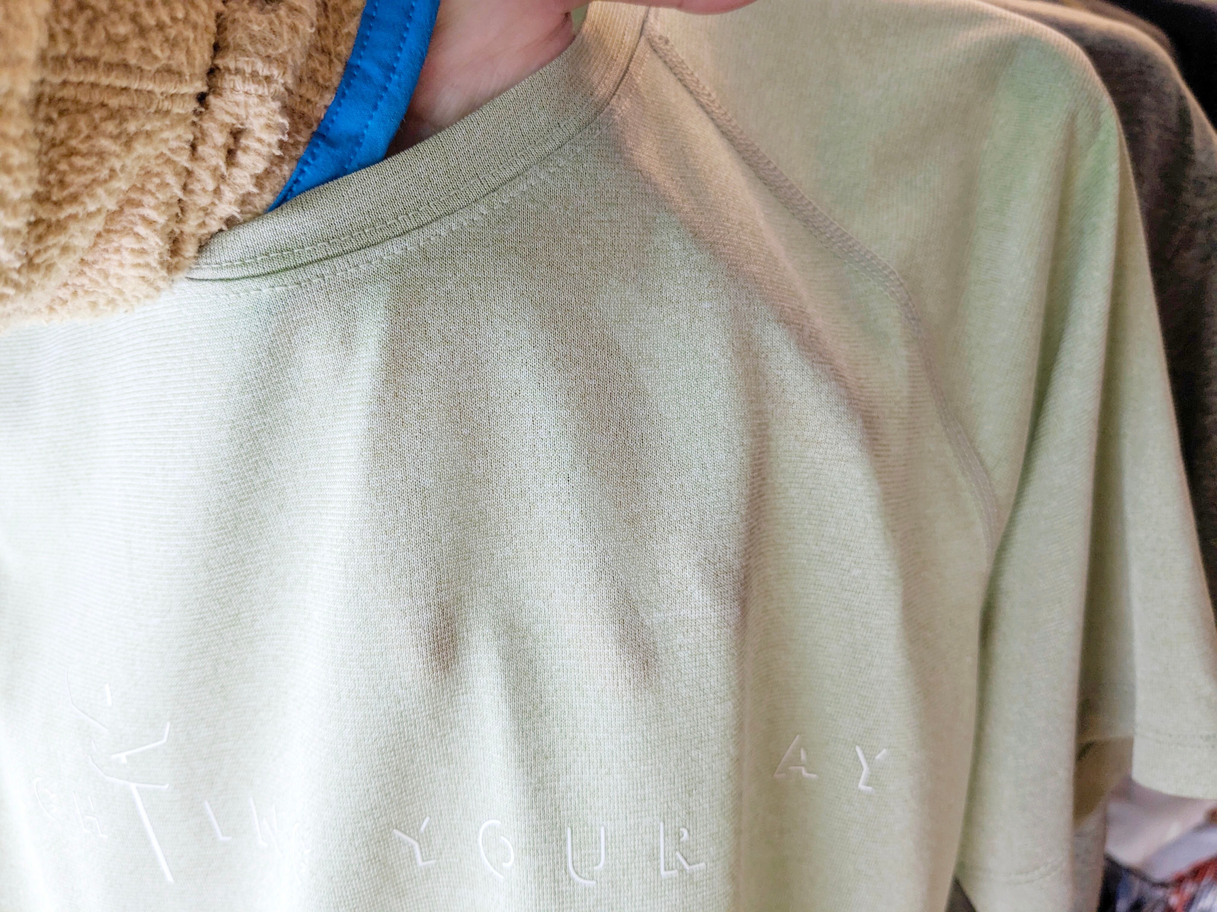 トレランザックを背負ったときに背中が出ないよう後ろ身頃を長くとったり、 走った時の腕振りがしやすいようラグランスリーブを採用したりと、トレイルランニ ングのシーンで最大限のパフォーマンスが発揮できるようオリジナルパターンを設計