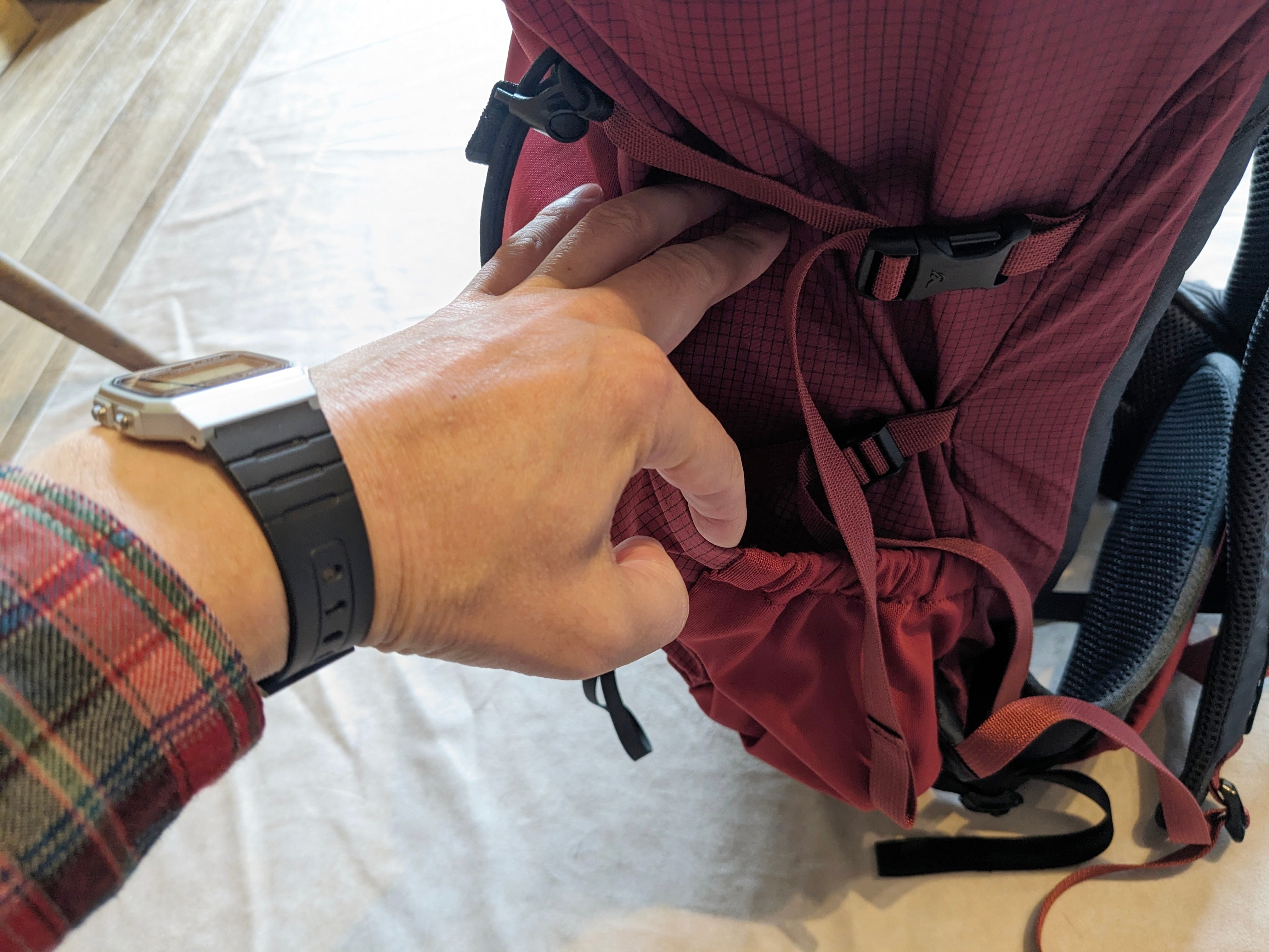 伸縮性のあるサイドポケットとフロントポケットは、すぐに摂り題したいアイテムやボトルの収納が可能。